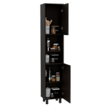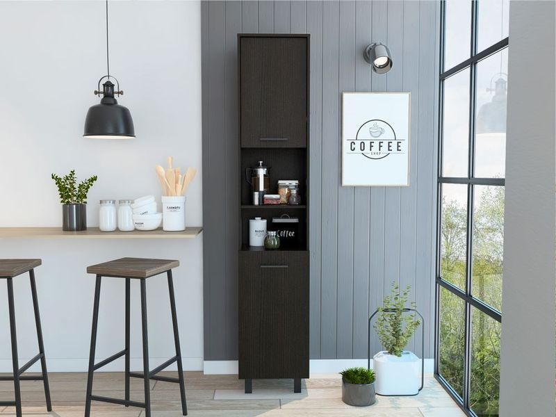 Alacena, variedad de entrepaños, espacio para microondas, 2 puertas batientes, manijas y patas metálicas.